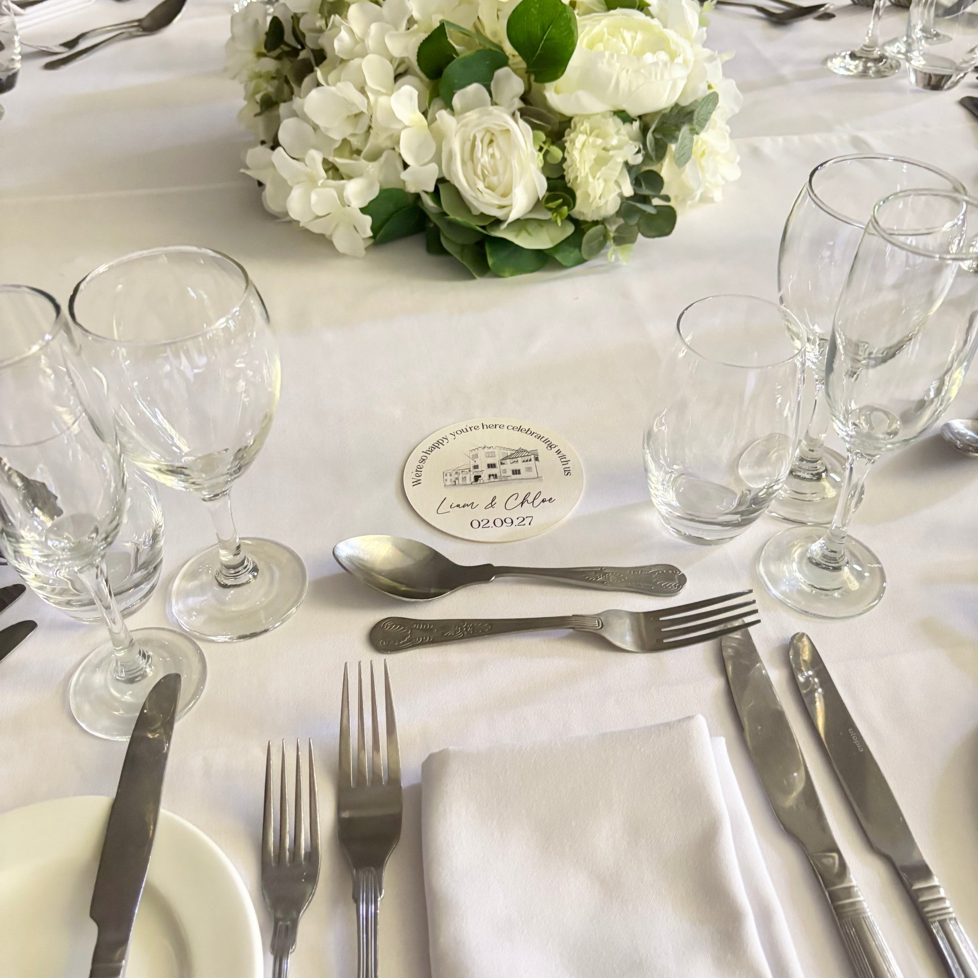 Each coaster can be created single-sided or double-sided, with your choice of wording, design, or illustration. If you’d like to include a hand-drawn venue illustration, this is charged separately — but once purchased, the illustration can be used across any of your wedding stationery. Coasters can also be made without an illustration if you prefer a simpler design.